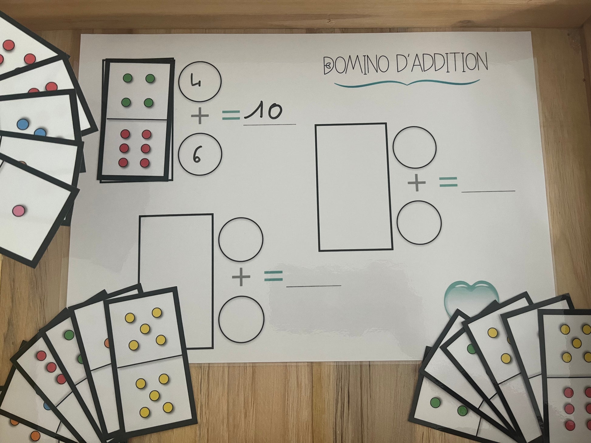 Ce calcul posé de domino permet de pratiquer des additions de manière ludique avec un plateau de jeu intégré.