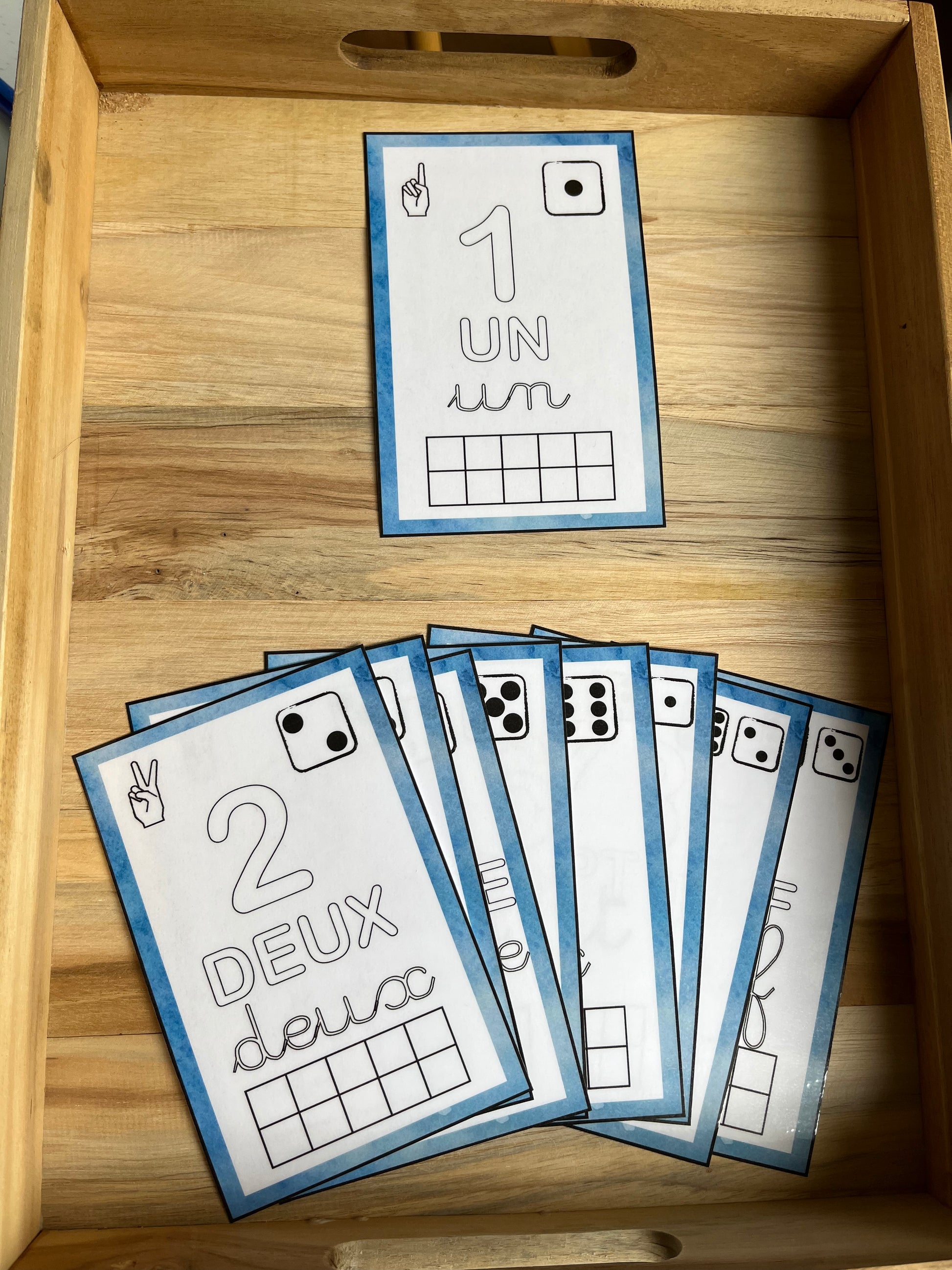 Cartes de reconnaissance des chiffres avec le chiffre sur les doigts, sur un dès, en chiffres, en majuscules, en cursive et les cases à colorer. Grâce aux cartes plastifiées il est possible d'écrire et de colorer directement les cartes !